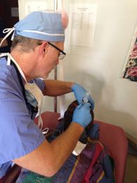 Michael Cosgrove, CRNA, administrator at Eye Surgery Center of Michigan in Troy, Michigan, performs a peri-ocular block for a patient prior to cataract surgery in Migori, Kenya.