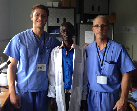 From right, Michael Cosgrove, CRNA, administrator at Eye Surgery Center of Michigan in Troy, Michigan, Kenya Relief Lab Director Benjamin and Cosgrove’s son, Ryan, at the Kenya Relief surgery center in Migori, Kenya. Cosgrove and his son were in Migori in August 2013.